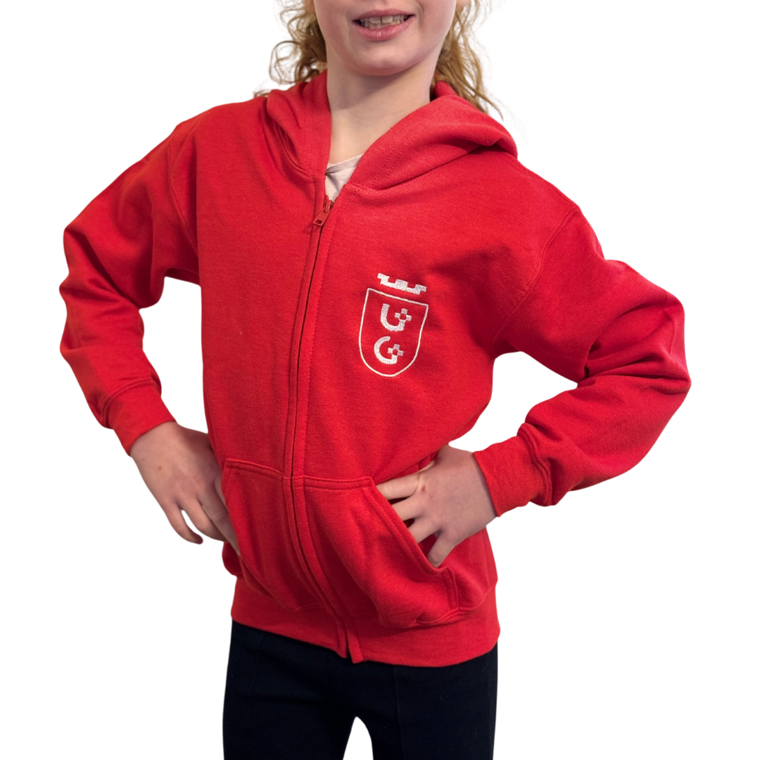 GILDAN Full Zip Sweatshirt Youth RED – S to rozpinana bluza dziecięca z kapturem, zdobiona haftowanym sygnetem Uniwersytetu Gdańskiego. Idealna dla dziecka w wieku około 7-9 lat.